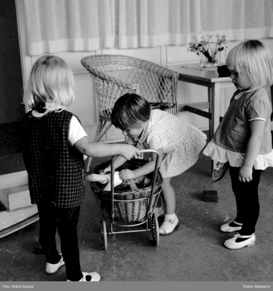 Tre flickor leker med docka och dokvagn på daghem i Varberga, oktober 1967