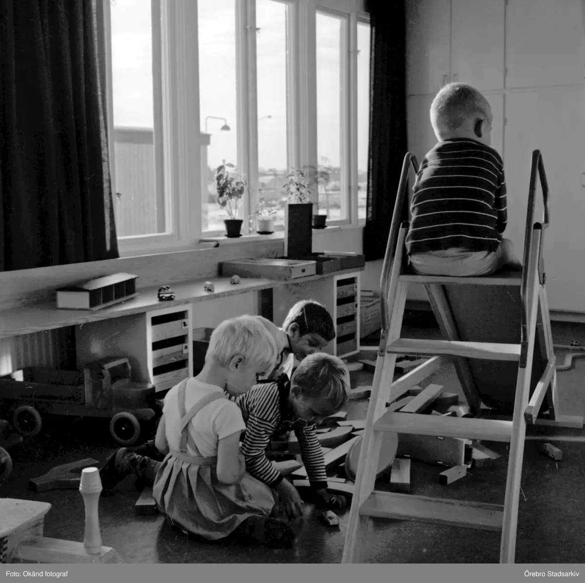 Barn leker med bilar och rutchbana på daghem i Varberga, oktober 1967