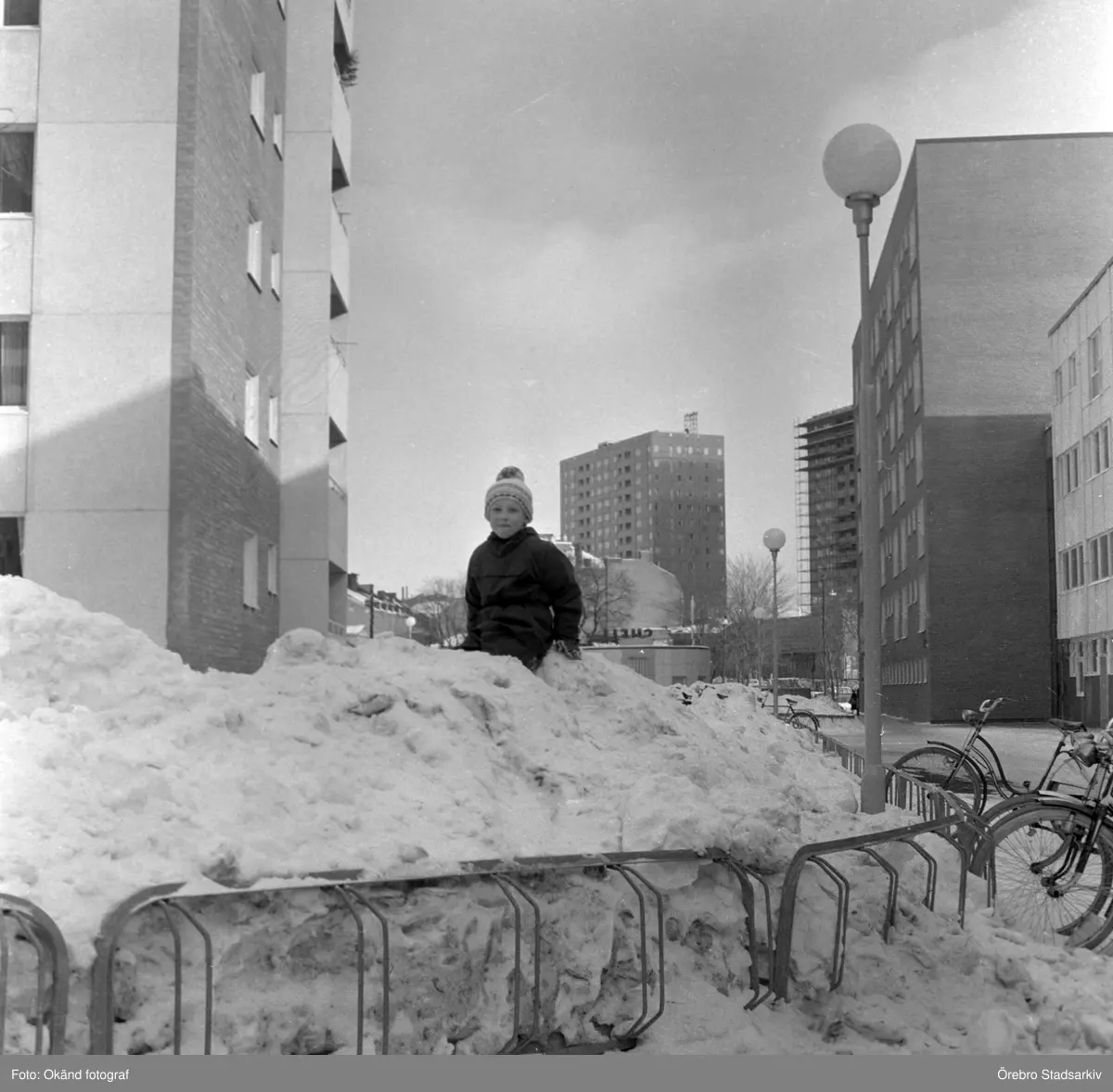 Barn står i snöhög på gården Drottninggatan 56, 1970-tal