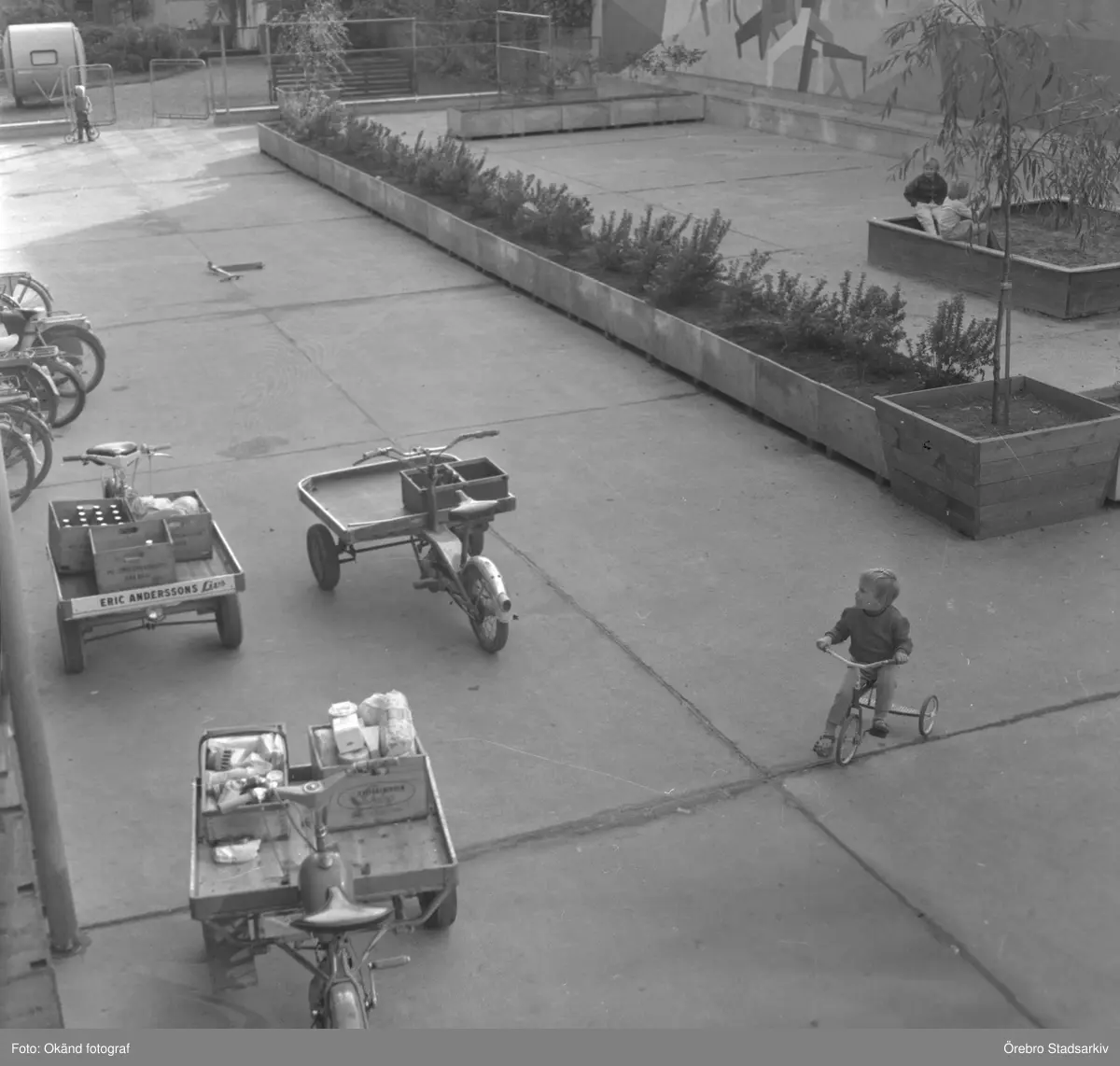 Tre budcyklar samsam med lekande barn på gården Trädgårdsgatan 24, 1960-tal