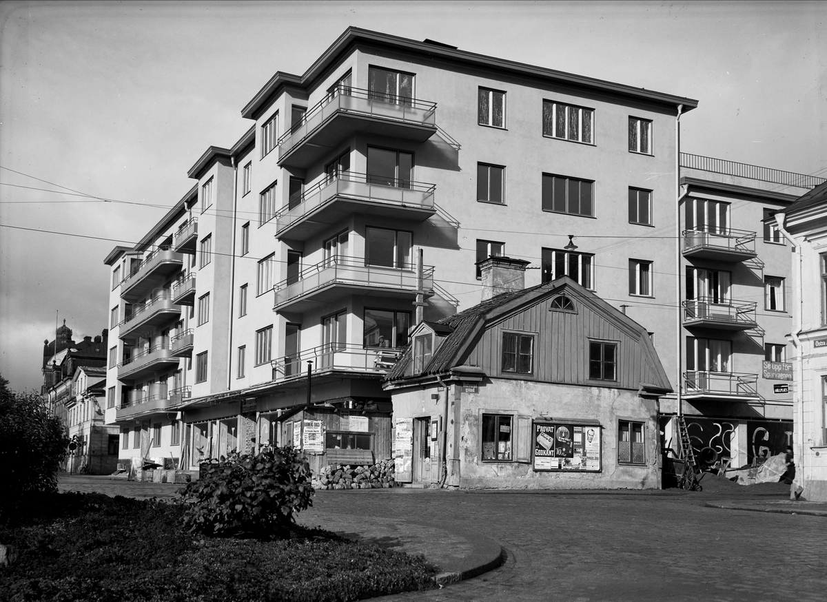 Bostadsrättsföreningen Islandsgården under byggnation, kvarteret Örnen, Östra Ågatan - Bäverns gränd, Uppsala oktober 1936. Delar av krogen "Sju helvetes gluggar" är kvar