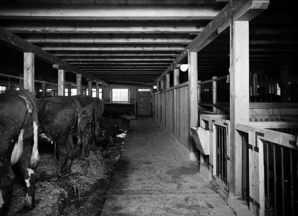 "Rationell planering av jordbrukets ekonomibyggnader ett tidens krav" - interiör i den nya ekonomibyggnaden, Högby gård, Uppland 1937