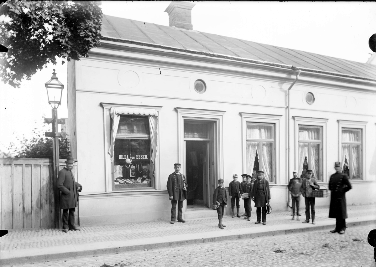 Män och pojkar står utanför affär, Sysslomansgatan, Uppsala