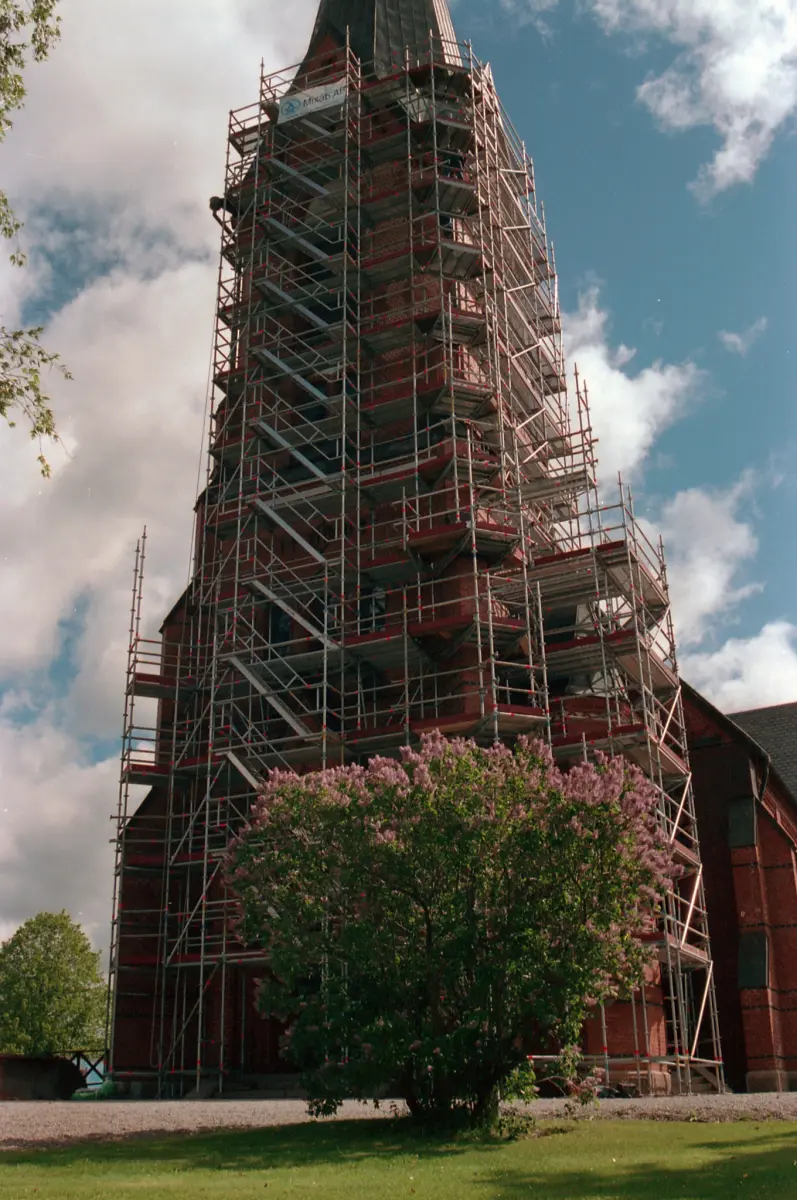 Högsäters kyrka renovering tornfasader 2009, torn med ställningar, koret