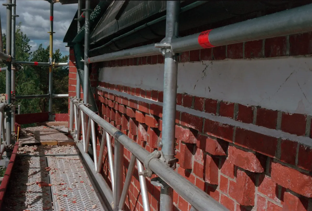Högsäters kyrka renovering tornfasader 2009, fris, takfot, S-fasad, plan 3 under renovering