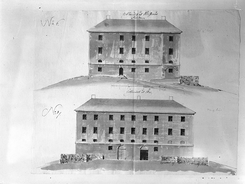Västerås slott. Slottets södra fasad överst och östra fasad nederst. Uppmätning i februari månad 1814, P.W. Palmroth.