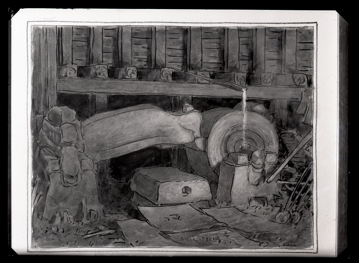 Akvarell av F. Boberg. smälthammaren, bruket i Färna, Gunnilbo, Västmanland.