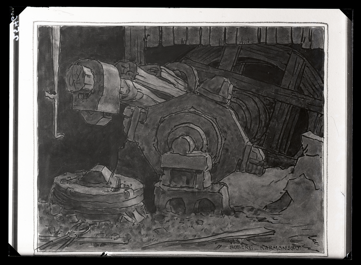 Akvarell av Ferdinand Boberg. Räckhammaren, bruket i Karmansbo, Hed, Västmanland.