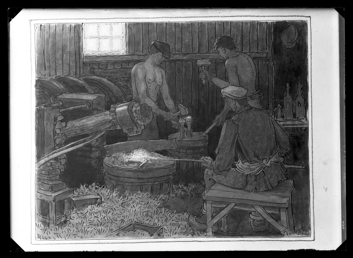 Akvarell av Ferdinand Boberg. Spiksmed i arbete.