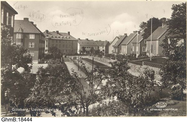 Uddevallagatan, parti norrut, fr. v. nr 6 x Uddevallaplatsen, 8 x Uddevallaplatsen, 10, 12 x Falkgatan 18 (pensionärshem), 14 (barnavärn), 15, 13, 11, 9, 7.