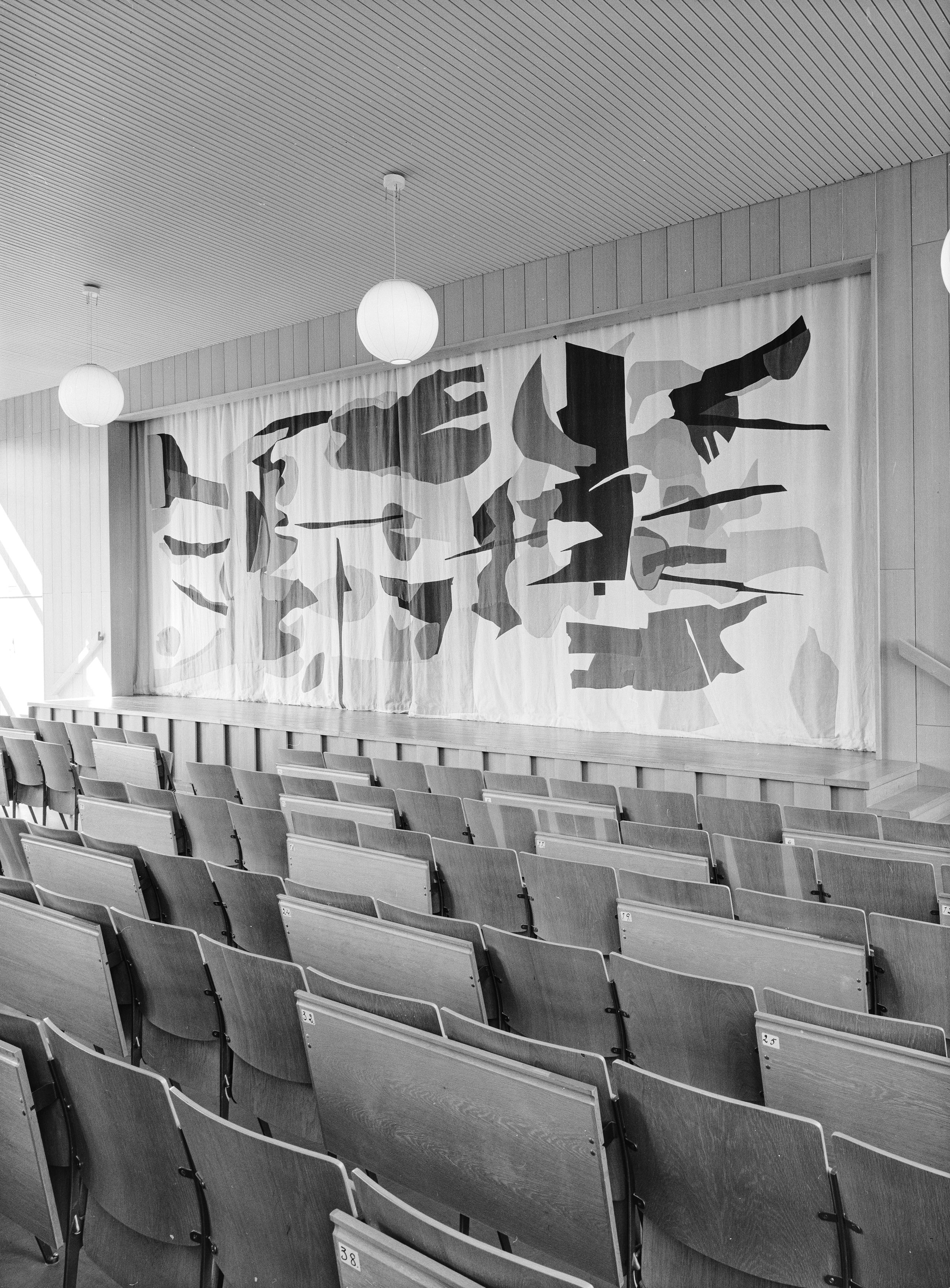 Beskrivning: Interiör inifrån Lidingö läroverk. Scen med draperier.