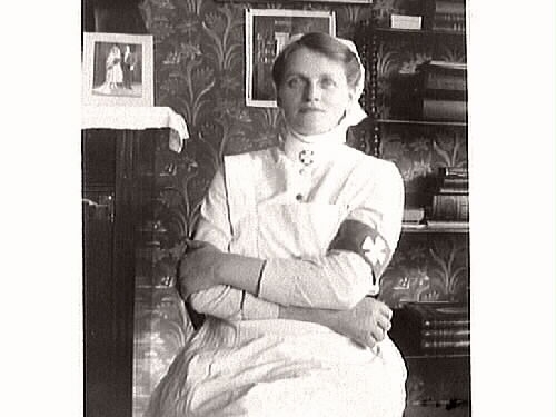 Porträtt av en sjuksyster i hem-miljö. Kvinnan kan möjligen vara Laura Albrektsson.