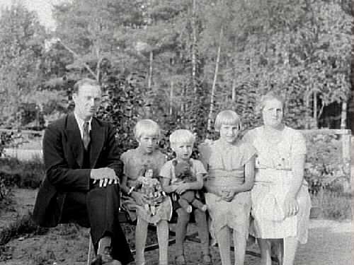 Foto av Hjalmar Magnusson med familj. Bilden är tagen utomhus. Från vänster: Hjalmar Magnusson, barnen; Iris Magnusson, Tore Magnusson, Lilian Magnusson och hustru Judit Magnusson.
