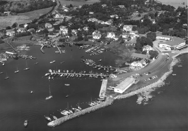 Flygbild, text: "Flygfoto över Gottskär." Vy över Gottskär och småbåtshamnen i viken med många bryggor för segel- och motorbåtar. Enfamiljshus och trädgårdar. Till höger ligger det gamla badhotellet, senare bl a lagerförsäljning av kläder och restaurang "Hamnkrogen". Tvärs över vägen till vänster ligger byggnaden där Jönssons konditori låg i flera decennier innan det stängde 2017.