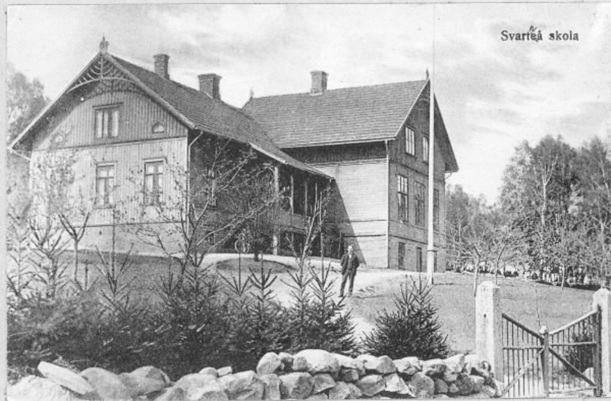 Bild 1: Vykort, "Svartrå skola", folkskolan. En man står på grussgången som leder från grinden upp till skolan. I slänterna är lövträd planterade medan stengärdsgården kantas av granar. Troligen uppförd 1904 eller 1905 utifrån årtalen på Bild 2.