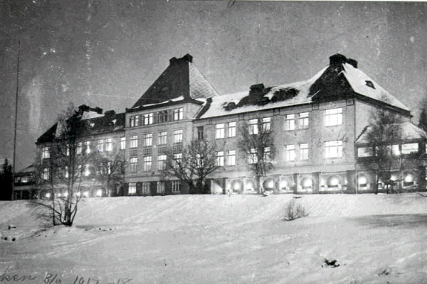 Exteriör av Lia Sanatorium upplyst kvällstid 1917-1918 vintertid.