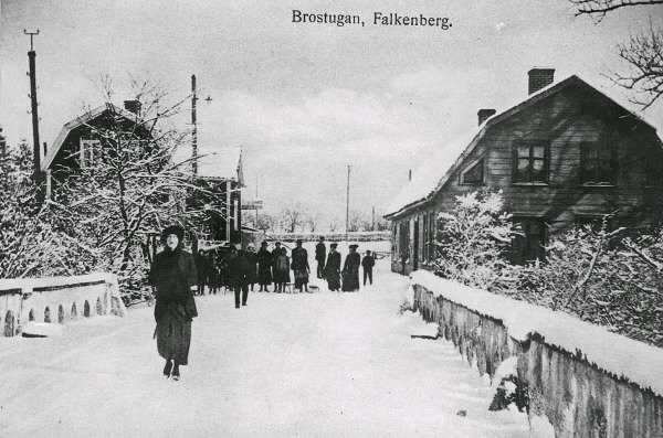 Vykort, "Brostugan, Falkenberg". Vinterbild av Tullbrons östra fäste med en kvinna i förgrunden och bakom henne en liten folksamling mellan husen. Brostugan ligger till höger och uppfördes av staden som tullstuga till broarrendatorn, medan bron från 1761 var bekostad av staten. Huset byggdes till av arrendator G. Rylin som gavs tillstånd att driva krog där. Stadens ungdomar kunde anordna dans och andra arrangemang i ett större rum och Falkenbergs första tryckeri inrättades 1875 i ett mindre av redaktör A F Möller. Staden övertog Tullbron 1910 och all brotull upphörde 1913.