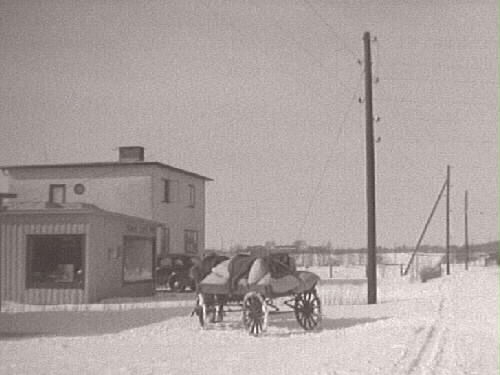 Tvååkers Elaffär AB och ett bostadshus i funkisstil vid Fastarpsvägen i Tvååker vintertid. I förgrunden en hästdragen vagn lastad med (sädes)säckar framför sadelmakare Georg Olssons tomt, Fastarpsvägen 24. Ca 1940.