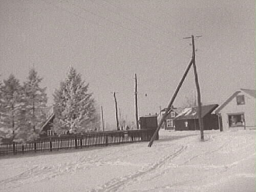 Fastarpsvägen i Tvååker. Foto från vintern 1941-1942. T h Bergendahls affär, t v därom en lagerbyggnad för diverse grövre varor oljor mm. T v mellan träden skymtar Gästgivaregården. Längts gatan står el- eller telefonstolpar.