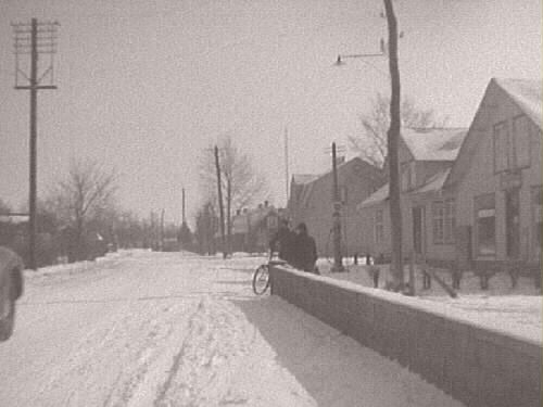Fastarpsvägen i Tvååker vintertid. Till höger ligger affären "Rosenqvista". Längs vägen står el- och telefonstolpar.