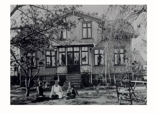 Mangårdsbyggnaden till Almebergs gård (Reisens) år 1900, kv Pilsberg i hörnet av Skansgatan - Ringvägen. Tre kvinnor sitter i trädgården nedanför verandan.