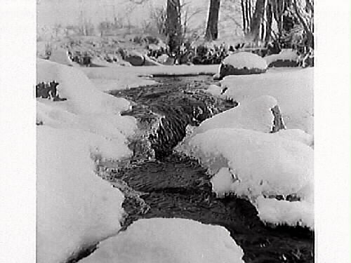 Vinterbilder av en bäck som rinner mellan Ölmevallasjön och byfjorden.