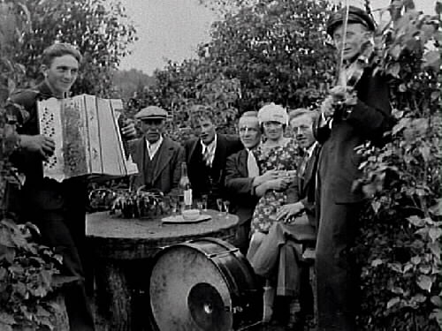 Spelmännen Sten Svensson och Erik Svensson med sällskap i en syrenberså. På bordet står en flaska och supglas. Under bordet står en trumma med cymbal. Sittande från vänster: Sten och Eriks far, Anders Svensson (han var stenhuggare och gjorde alla grunder till husen i Gällared under 1920-talet.), Bror Johansson, Roalyckan, Drängsered, Emil Johansson, Skogsgärde, Drängsered, Rut Svensson, Vismered, Artur Johansson, Bonnaberg, Gällared.