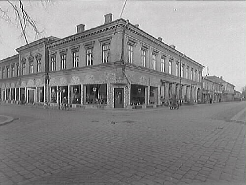 Rommelska fastigheten. Byggnaden låg i hörnet Kyrkogatan-Drottninggatan. Här har bottenvåningen fått ett helt annat uteende än det ursprungliga. Man ser fortfarande spåren av de tidigare välvda fönsteröppningarna, men valven som tidigare ledde till entrén är borttagna. Nu har moderna skyltfönster installerats och vid tiden hade Monark sin minutbutik här.