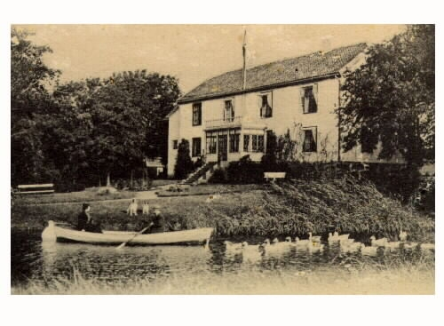Boningshuset vid Lindhovs kungsgård med ett par i en roddbåt i vattendraget nedanför huset. En gåsflock ligger intill båten.
