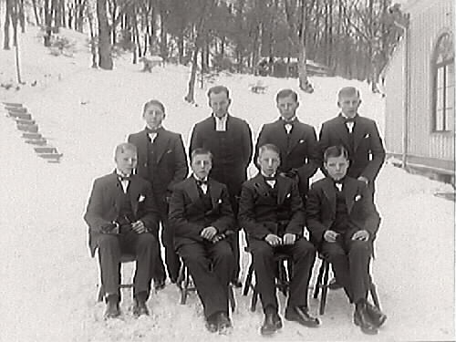 Konfirmandgrupp med en liten grupp pojkar ute i snön vid huvudbyggnaden på räddningshemmet Mäshult, uppförd 1880. Här inrättades då Hallands räddningsinstitution för vanvårdade barn, en uppfostringsanstalt för barn mellan 10 och 15 års ålder.