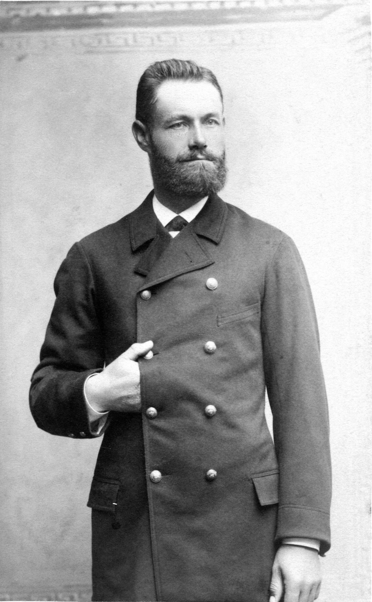 Mansporträtt av kustvakt Wallgren. Han har stoppat in höger hand mellan två av kavajknapparna.