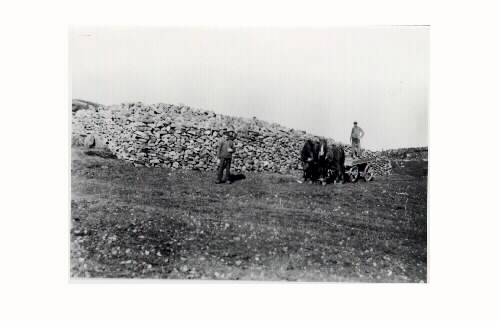 Stenbrytning. Sten som användes när E 6:an blev utbyggd vid Lindhovs gård. På bilden: Lars Bengtsson och på vagnen Otto Larsson. De har samlat ett jättestort stenröse på sin gård i samband med uppodling av mark. Där har sedermera blivit ett villaområde.