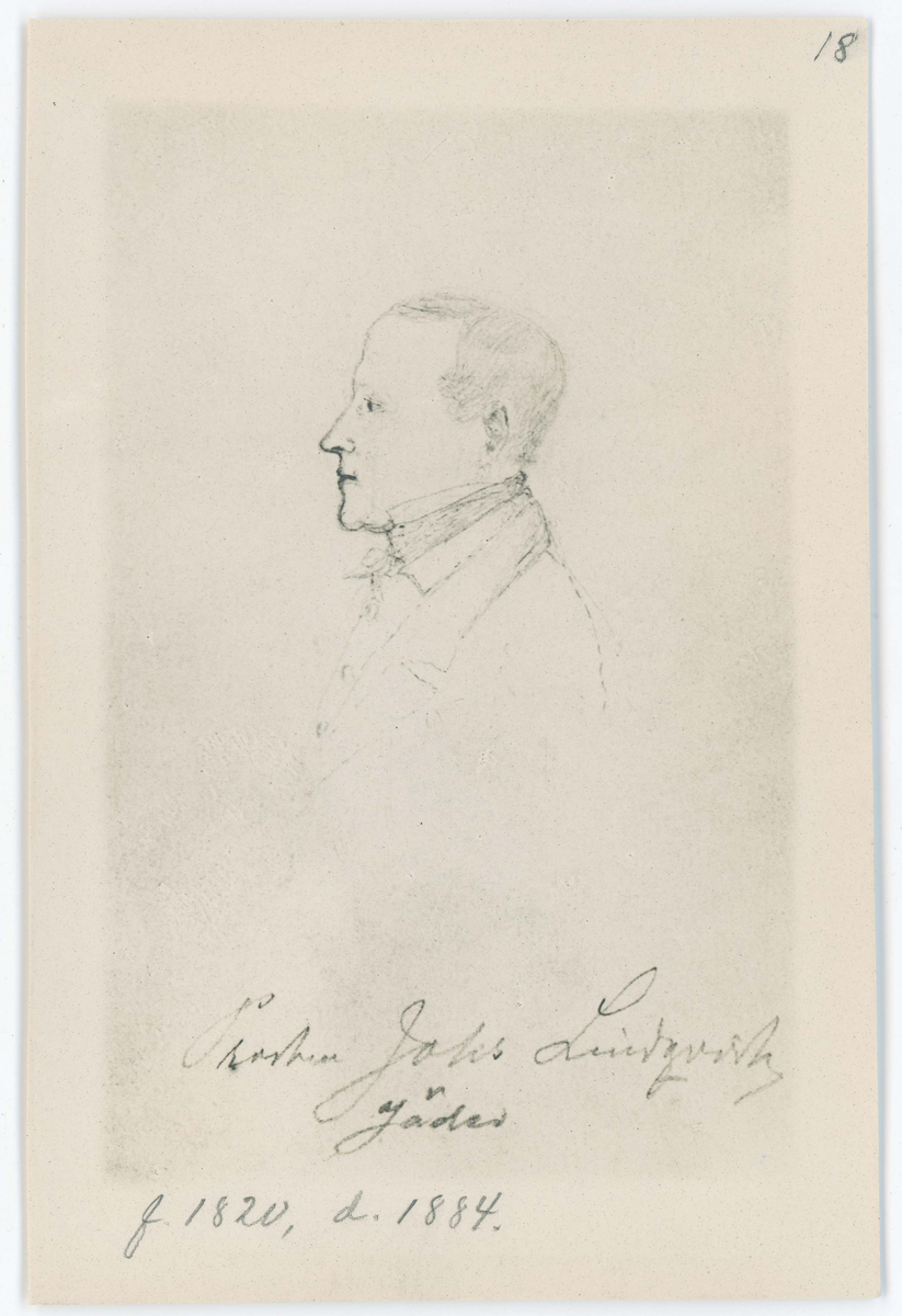 Porträtt tecknat på Prost Johannes Lindqvist i Jäder (Strängnäs stift). Född 16 Juli år 1820 i Jönköping. Död 28 april år 1884.
