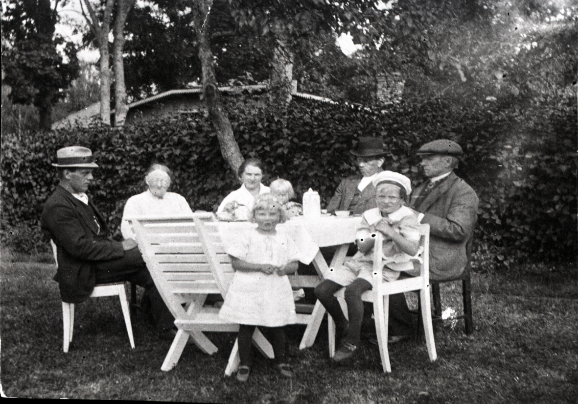Gruppbild vid kaffebordet i trädgården på Skurö.