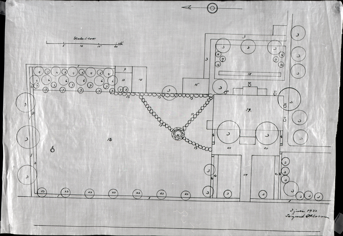 Skolområdet. Arbetsritning över trädgård juli 1933 av Sigurd Ohlsson.
