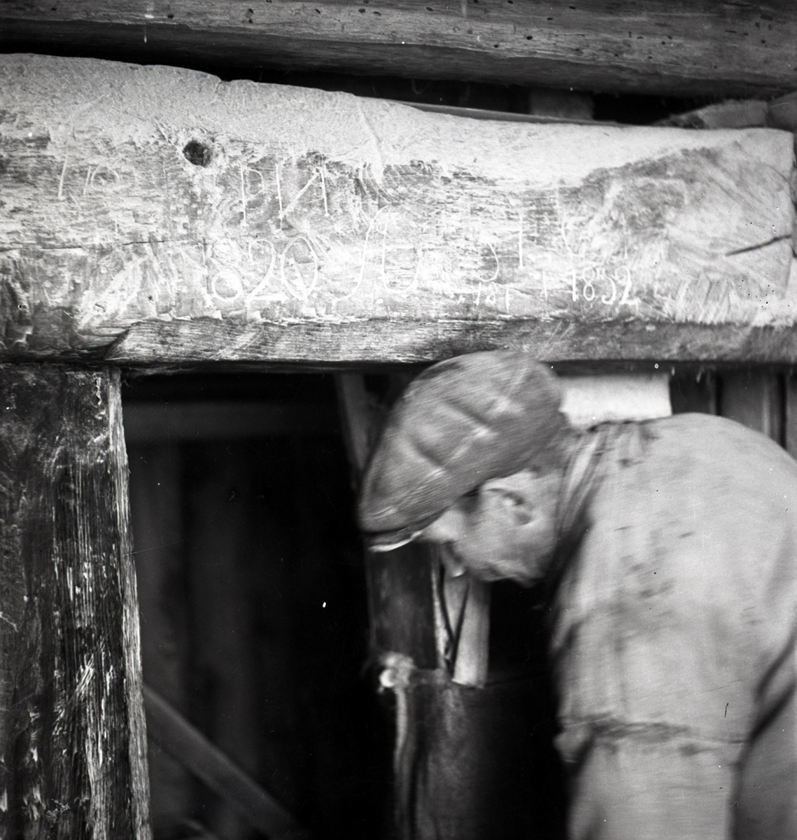 Väderkvarnsinteriör från Uggletorp med inskription på bjälke.