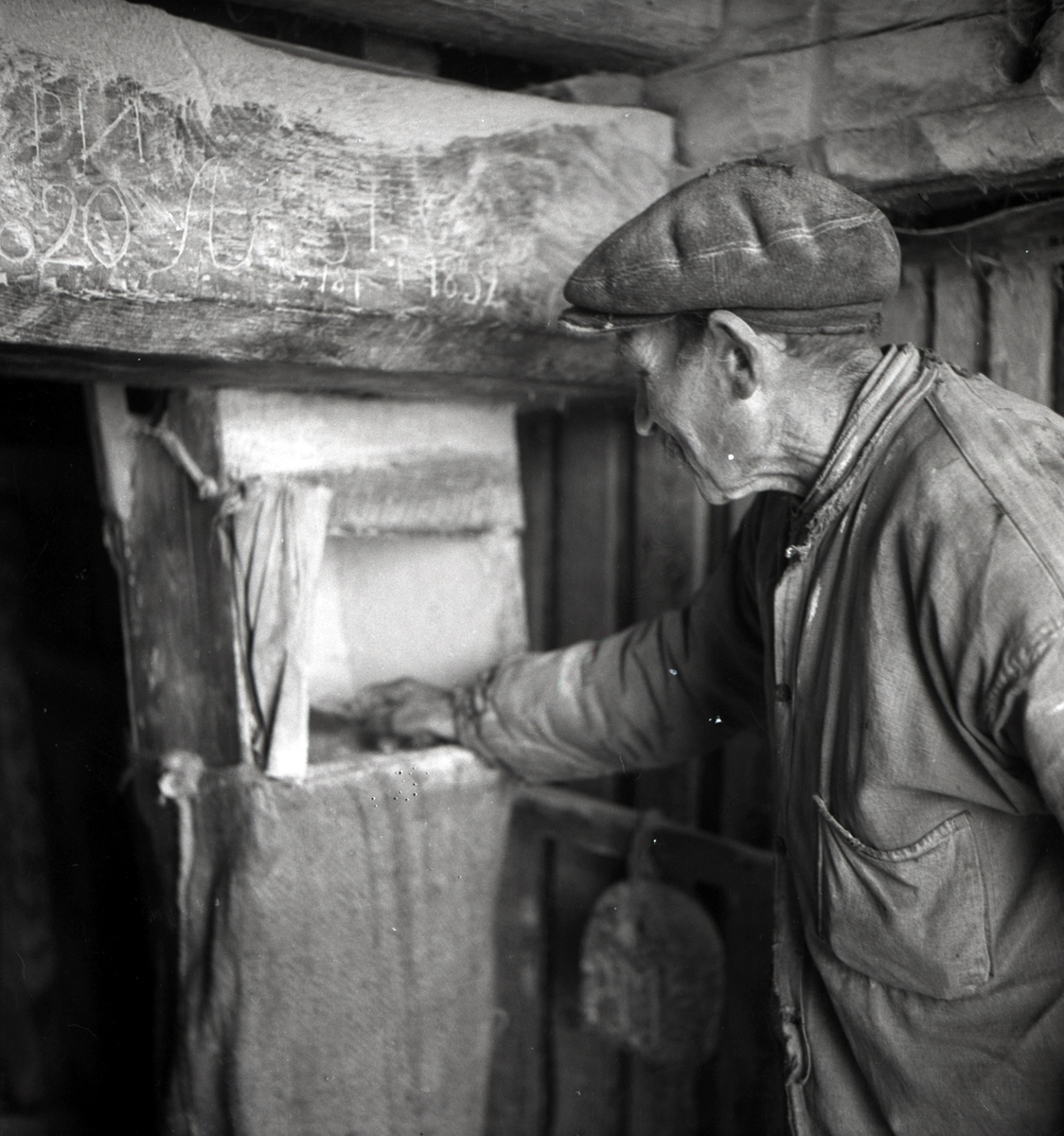 Väderkvarnsinteriör från Uggletorp med inskription på bjälke.