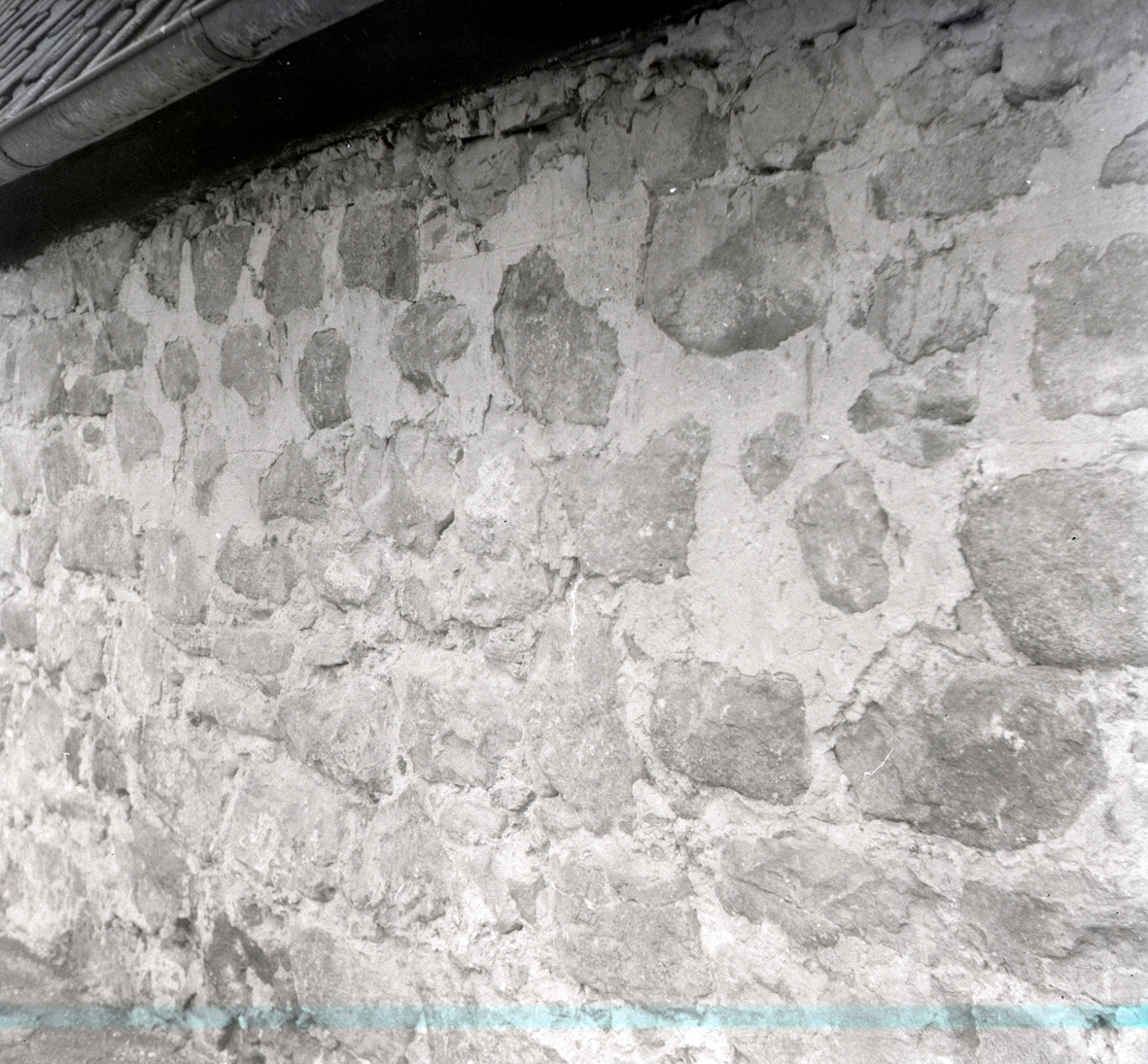 Södra långväggens murverk i Arby kyrka, medeltida.