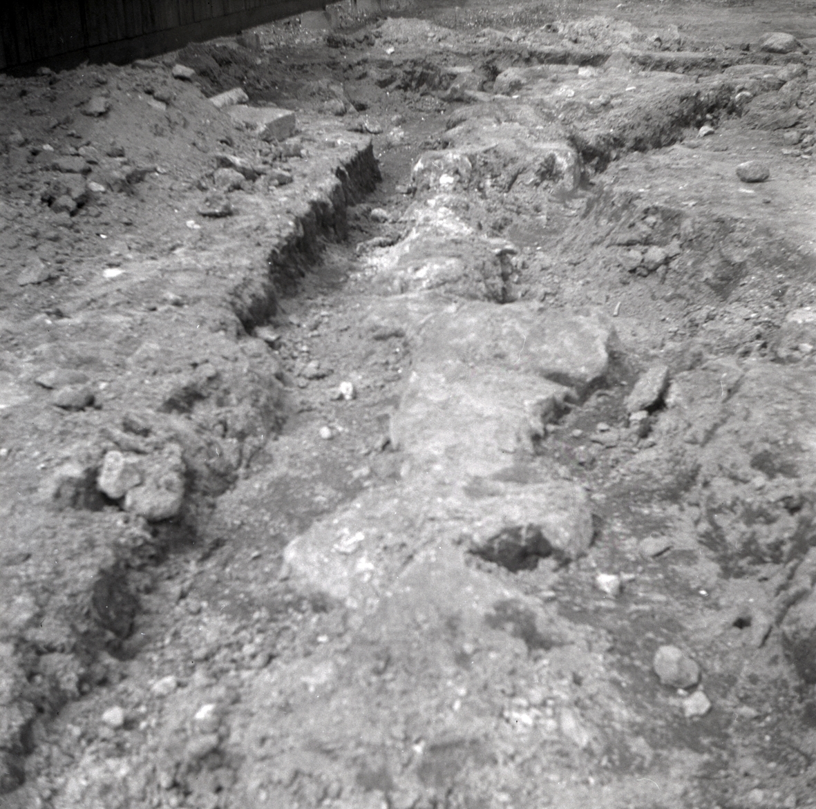 Arkeologisk utgrävning vid Krusenstiernska gården. Sena trasiga murrester vid SV sidan av källaren från SÖ.