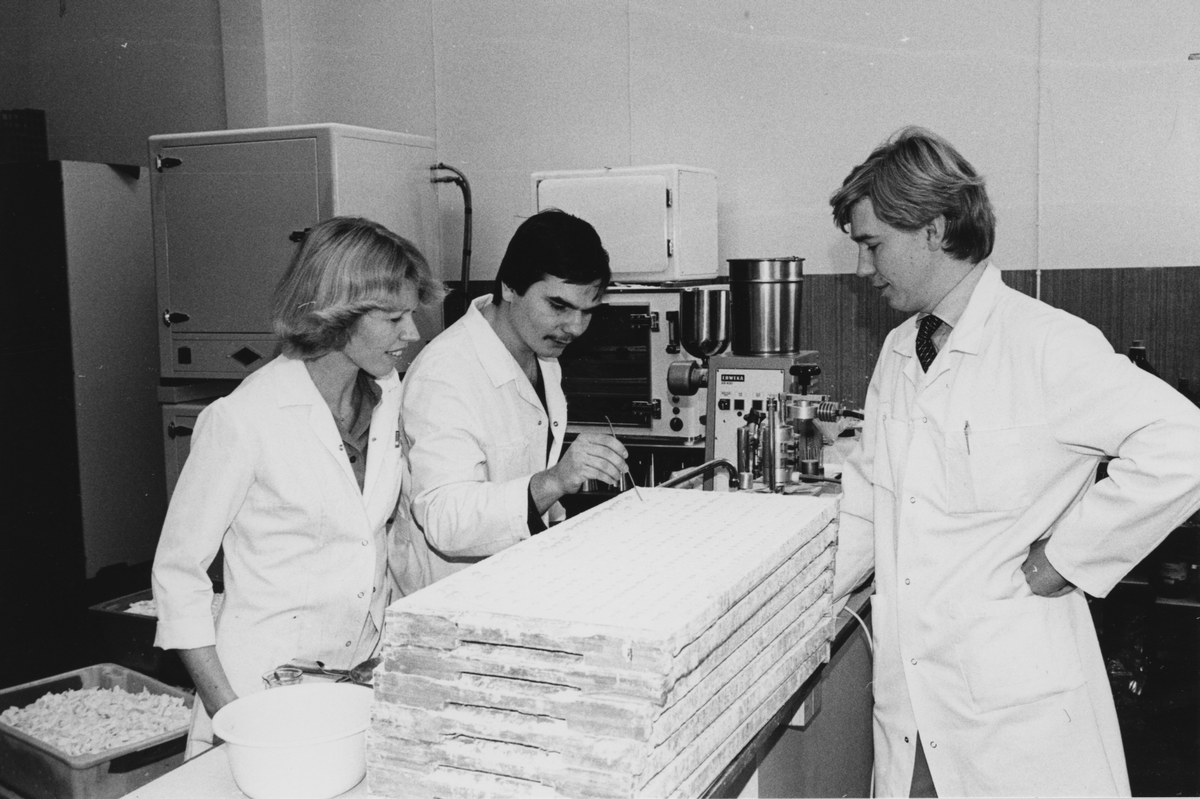 Elisabeth Öhrn, Lars Granberg, Tomas Trybom kollar ett gjutprov februari 1981.