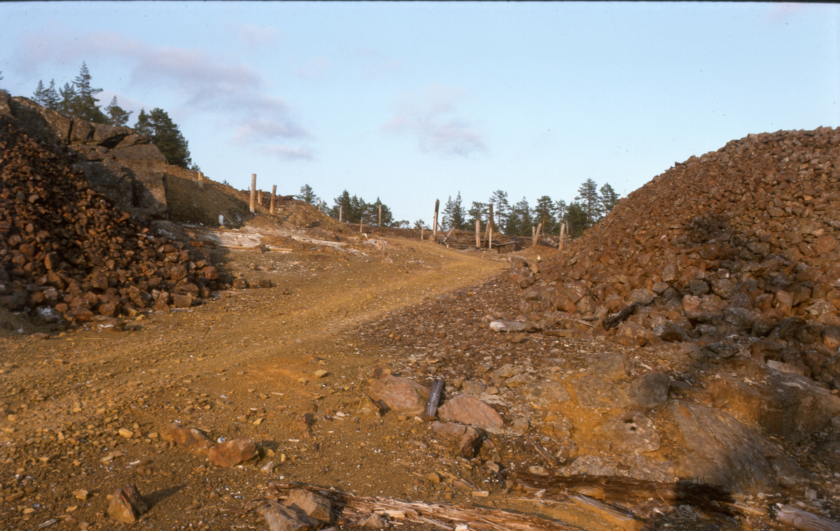 Flätsbo gruva. I bildens mitt en uppåtgående grusväg som passerar mellan två högar av bruten sten.