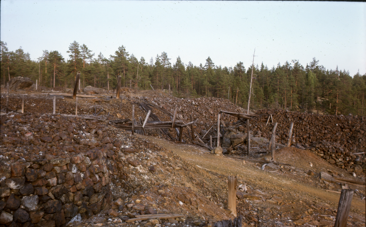 Flätsbo gruva. Bruten mark och en grusväg, tallskog i bakgrunden.