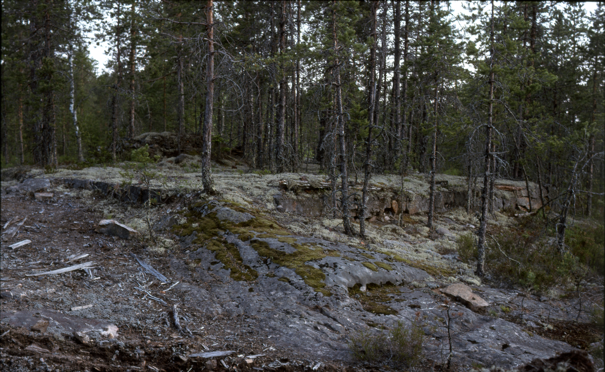 Flätsbo gruva. Skogsbild med tallar på mossig stenhäll.