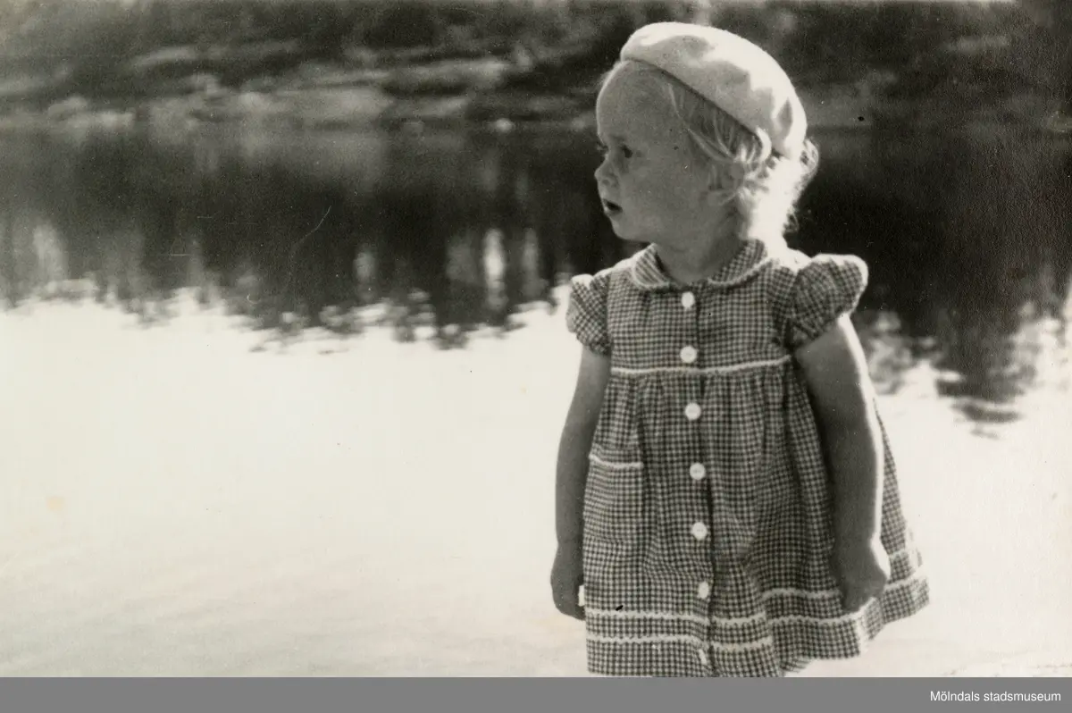Treåriga Stina Krantz står vid Horsikasjön 1949. Kusin till givaren samt dotter till Edit och Östen Krantz som bodde vid "Solvändan".