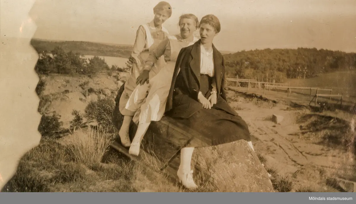 Tre kvinnor poserar sittandes på en berghäll, 1930-tal. I bakgrunden ses en torvtäckt samt Tulebosjön. Kvinnorna är troligtvis arbetskamrater från Stretereds vårdhem.