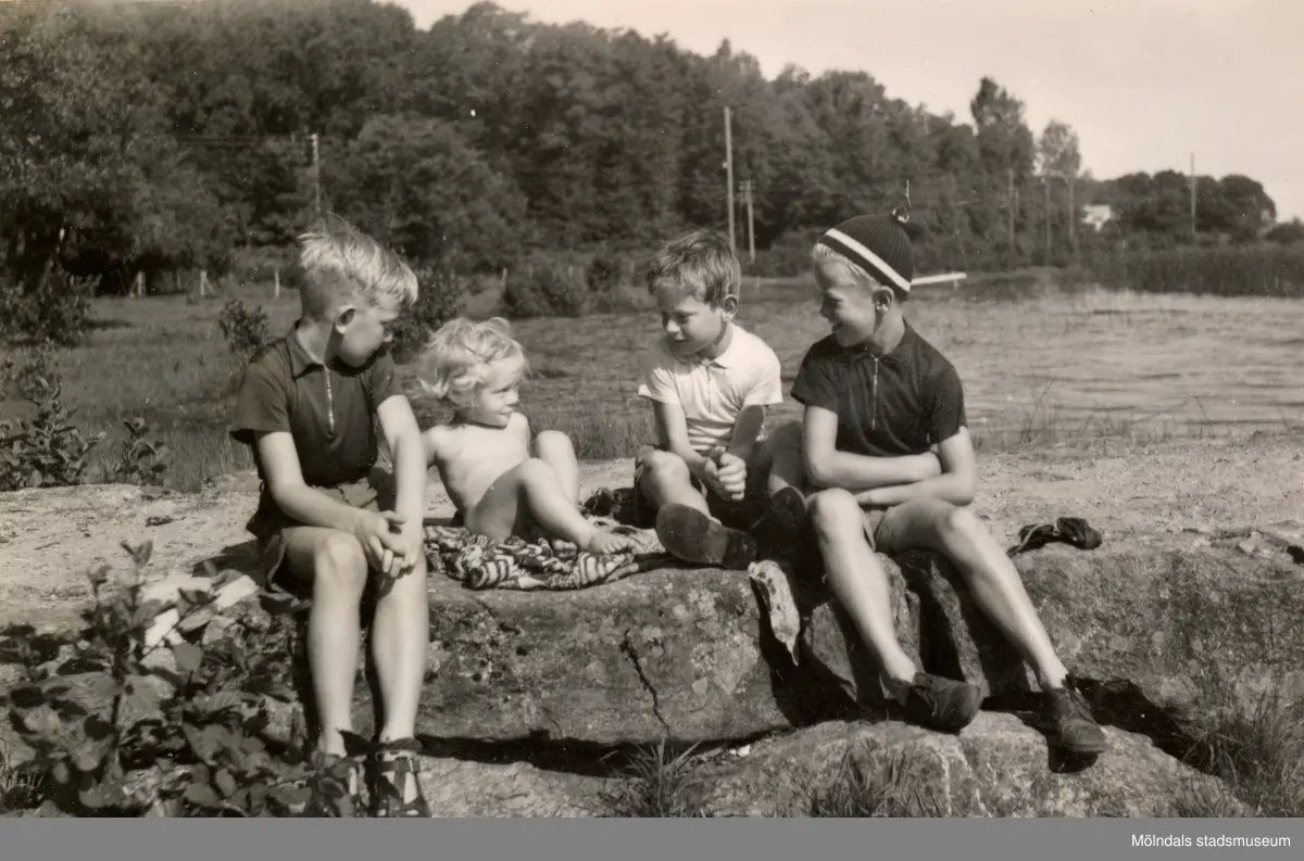 Eva Pettersson (född 1944, gift Kempe) sitter på en sten tillsammans med tre äldre pojkar (lekkamrater) vid Stenbryggan, Stretereds badplats, Tulebosjön år 1946.