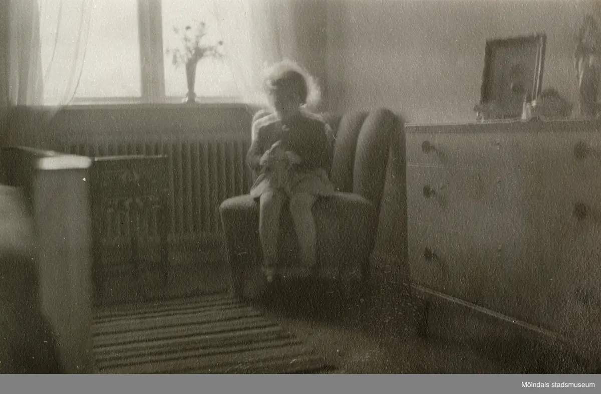 Eva Pettersson (född 1944, gift Kempe) sitter i en Emma-fåtölj i föräldrarnas sovrum, Torrekulla 1947.