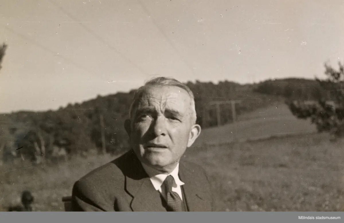 Carl Krantz (1880 - 1956) finklädd i kostym, Stretered 1940-tal. Carl var skomakare samt lärare och undervisade vid Stretereds skolhem 1917 - 1947.