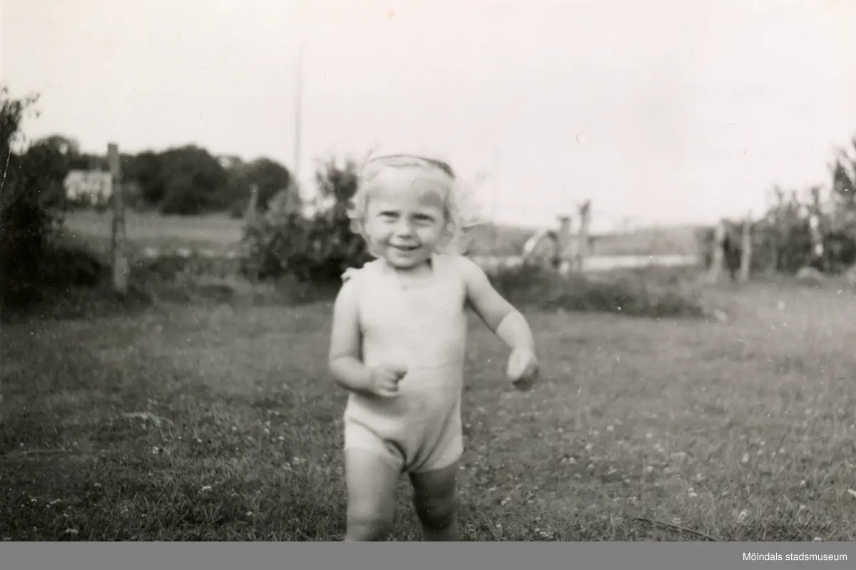Lilla Karin Pettersson (gift Hansson) står på gräsmattan vid Stretereds personalbostad i Tulebo 1948. Mormor och morfar bodde där. I bakgrunden ses Tulebosjön.