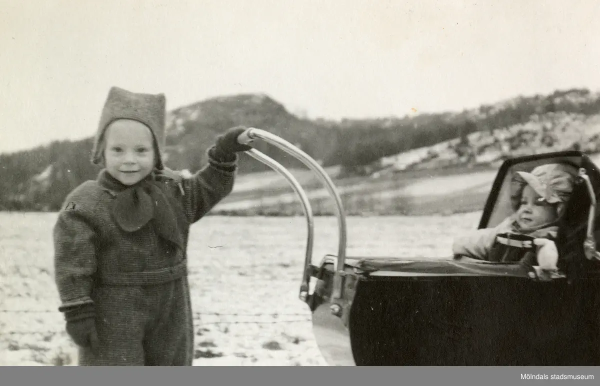 Eva Pettersson (född 1944, gift Kempe) kör kusinen Stina Krantz i barnvagn år 1946. Vommedal och Brattåsberget ses i bakgrundens mitt. Eva är dotter till Bror och Rosa Pettersson (född Krantz). Stina är dotter till Edit och Östen Krantz.